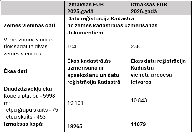 Īpaši tas attiecas uz kadastra datu reģistrāciju un aktualizāciju, kur līdzšinējais vienotais pakalpojums ir sadalīts vairākās maksas pozīcijās. Rezultātā maksa par viena kadastra objekta reģistrāciju atsevišķos gadījumos pieaug vairāk nekā divas reizes (no 52 uz 117 eiro), lai gan publiskajā komunikācijā šīs izmaiņas raksturotas kā nelielas.